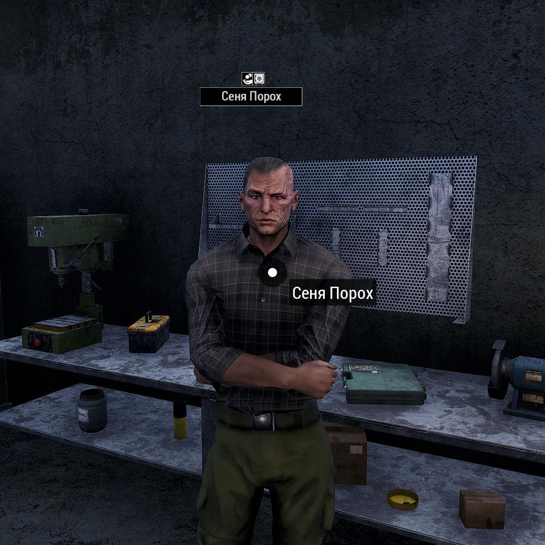 Сеня Порох (Торговец, Кладовщик) | + | Маленький ассортимент. | Золото, электроника, всякий хлам. | — | + | — | — | |