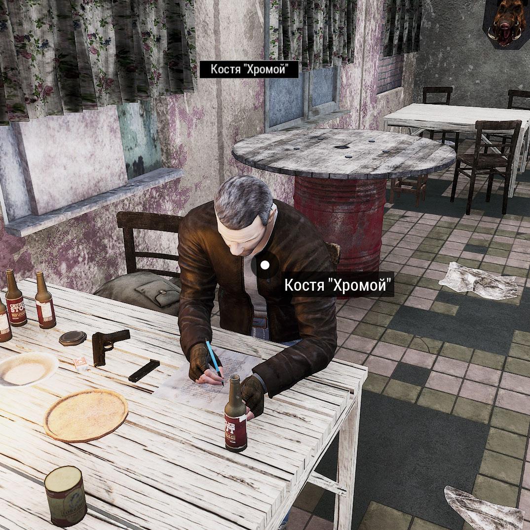 Костя “Хромой” Многоэтажка, парадная с надписью на входе “БАР Север”, сидит за одним из столов. | + | — | — | — | — | — | — | |