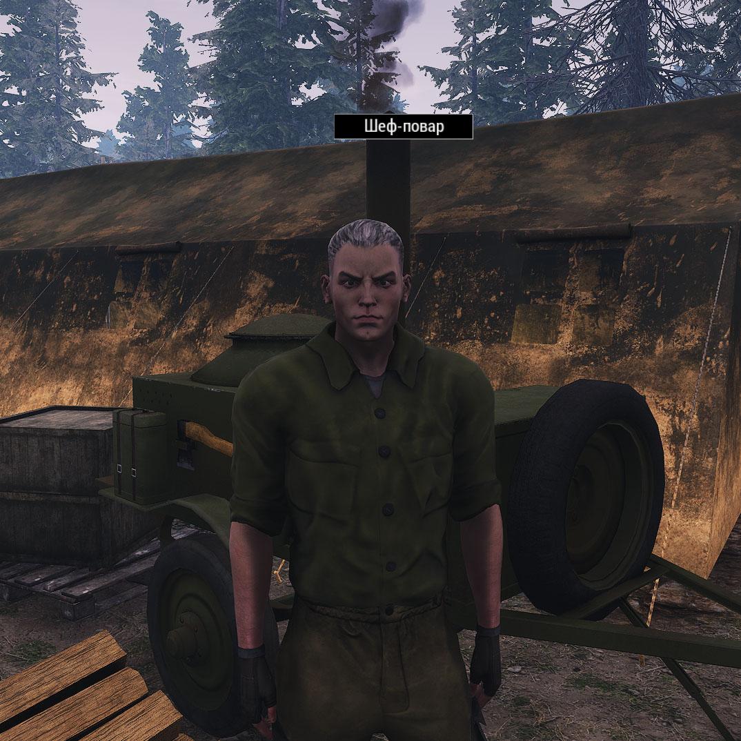 Шеф-повар Стоит у полевой кухни. | — | — | — | — | — | — | — | |