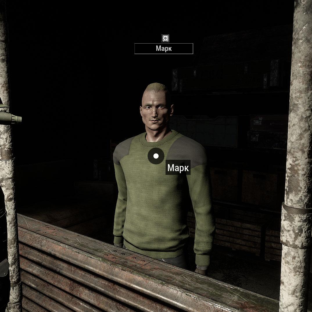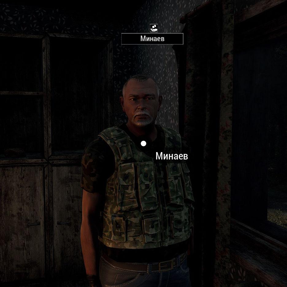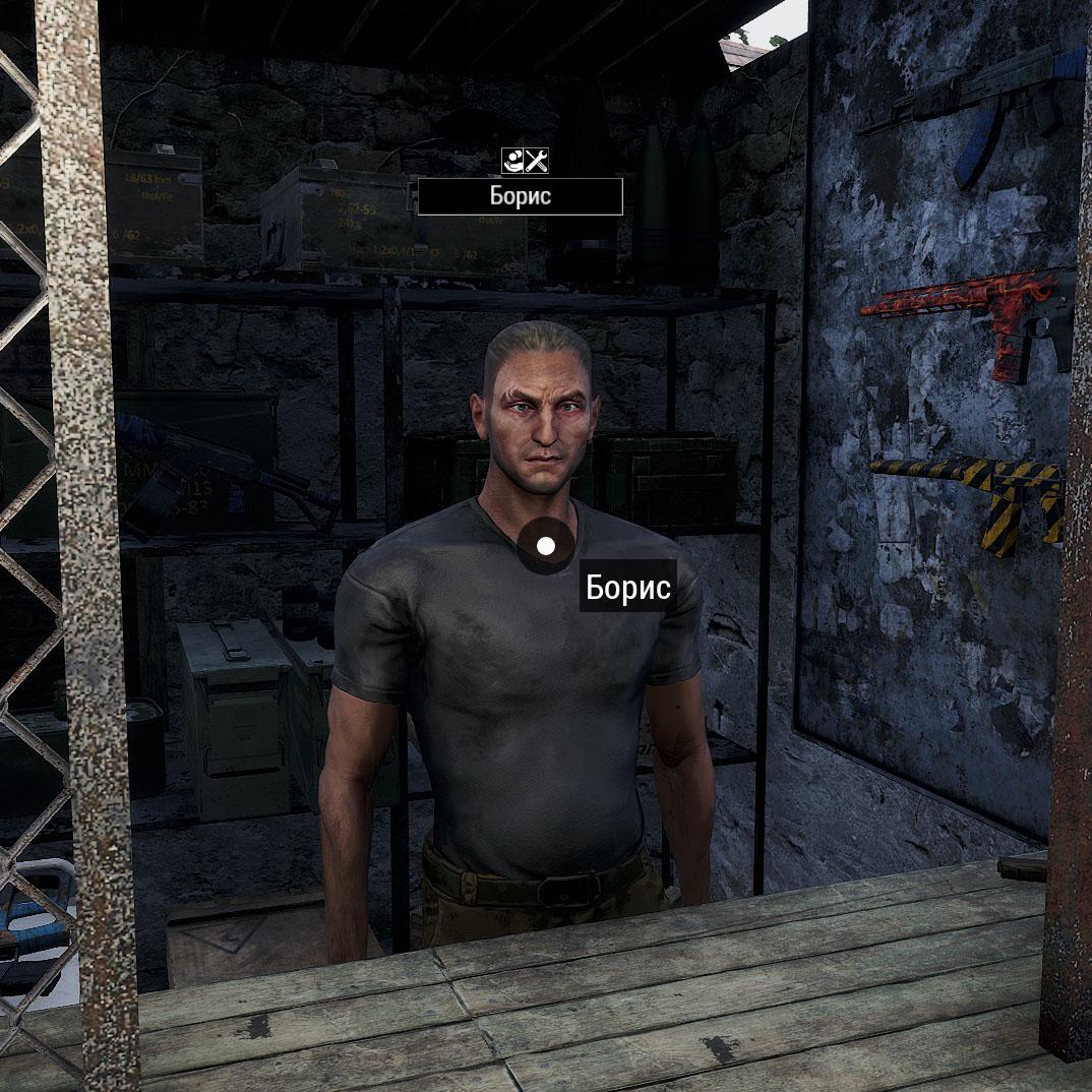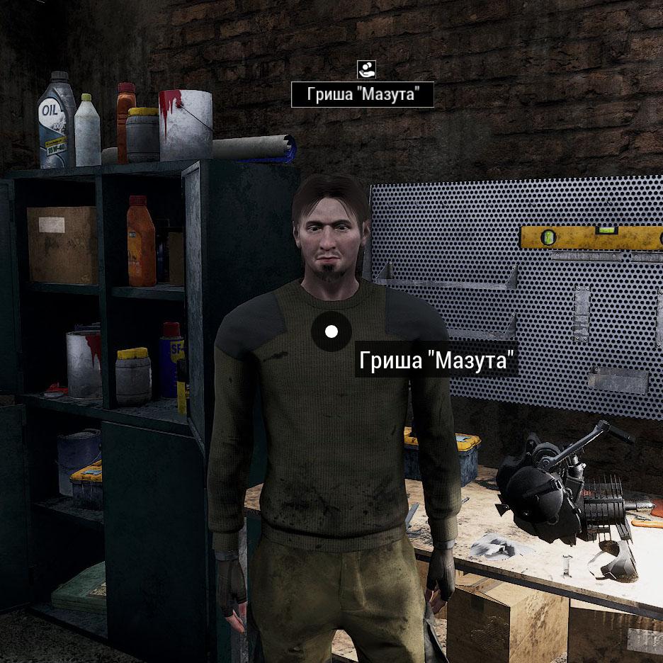 Минаев (Торговец) Второй этаж административного здания. | + | Маленький ассортимент. | Части мобов (которые обитают в округе), руда. | — | — | — | — | |