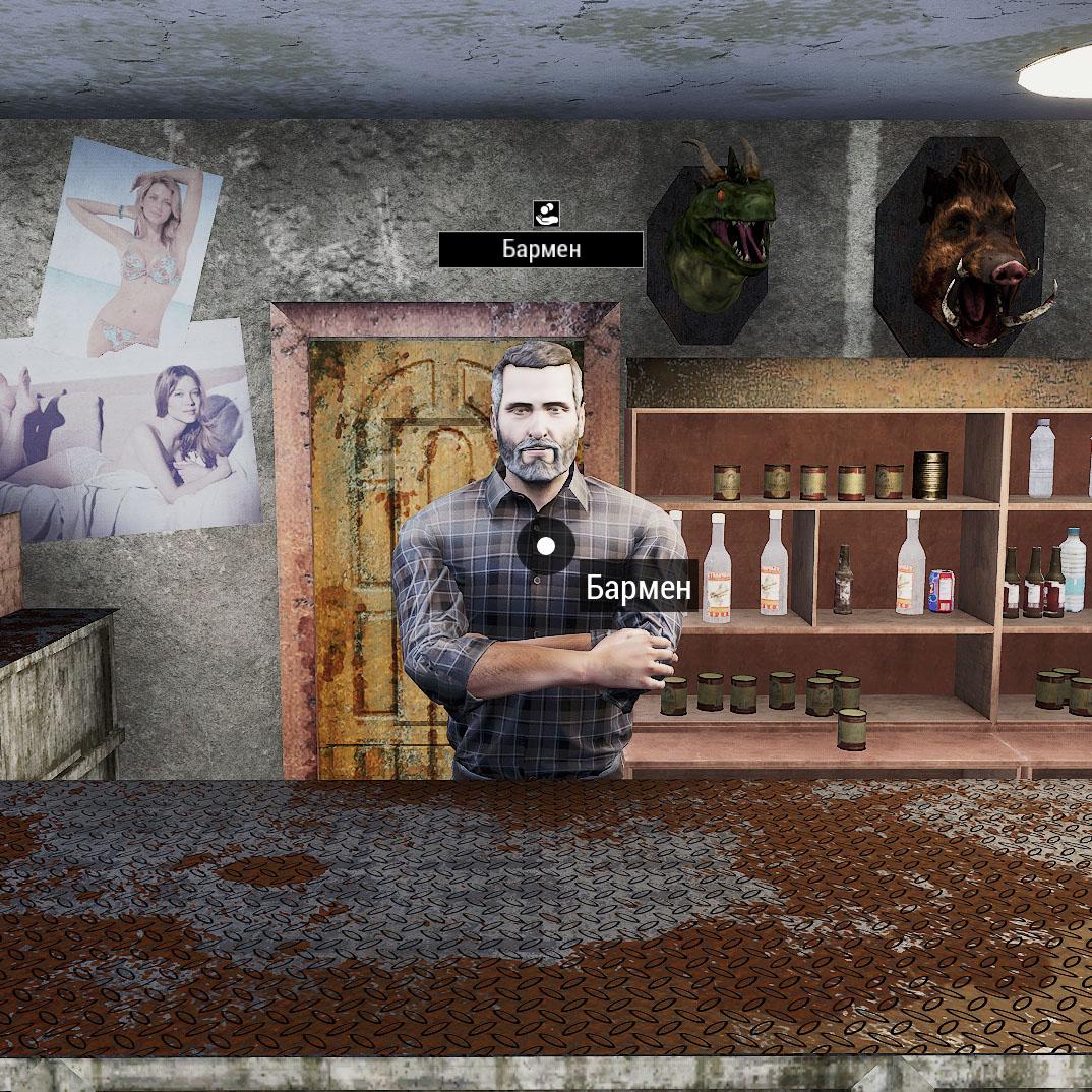 Бармен (Торговец) Многоэтажка, парадная с надписью на входе “БАР Север”, стоит за стойкой. | + | Еда, напитки. | Грибы, столовые приборы, мясо (сырое и жареное мобов, которые обитают в окрестностях Солнечного). | — | — | — | — | |