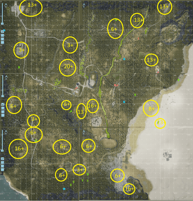 На данной карте красным отмечены схроны, в которых можно найти следующий лут: