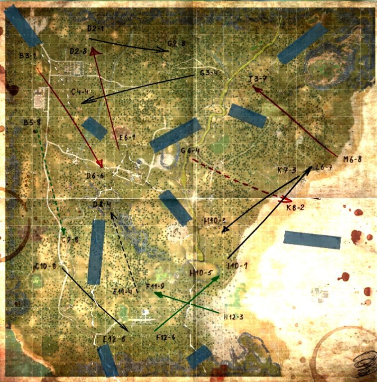 A7-3 — *перенесено в А6-5 — металлический ящик под деревом — [15] пули 12 кал., [2] средняя аптечка, [2] пластиковая бутылка, [5] драгоценный металл, [1] проволока, плоскогубцы, [2] пластик, [1] тушенка, Сухое красное вино урожая 2010 года.